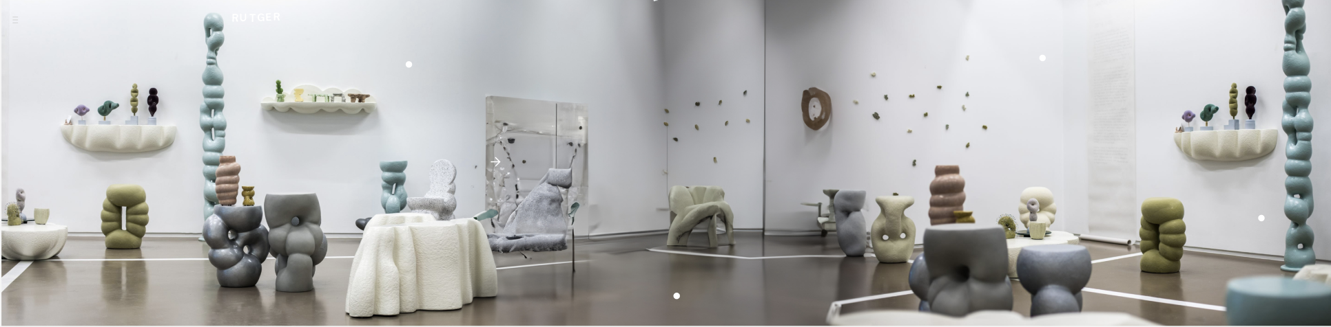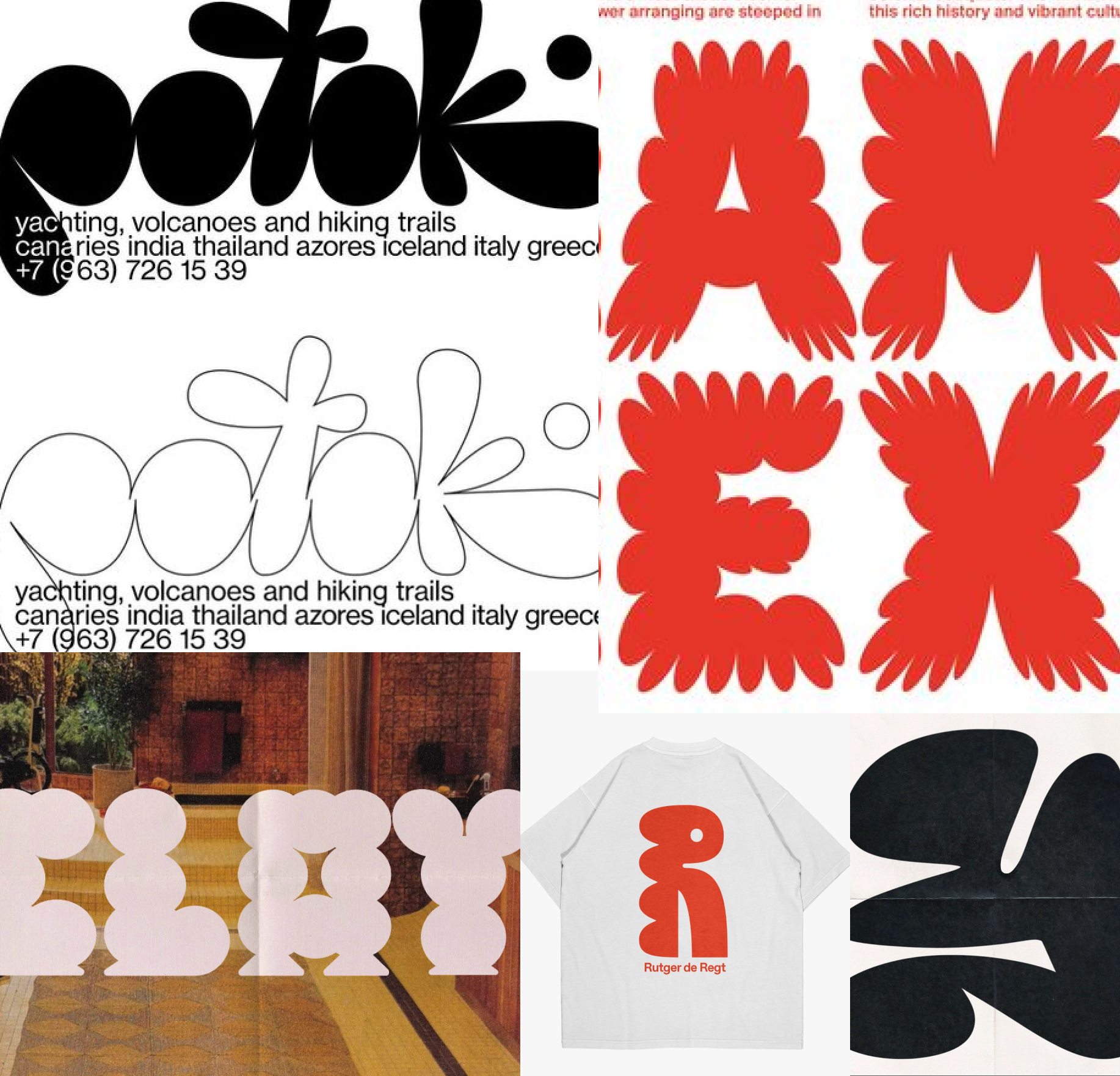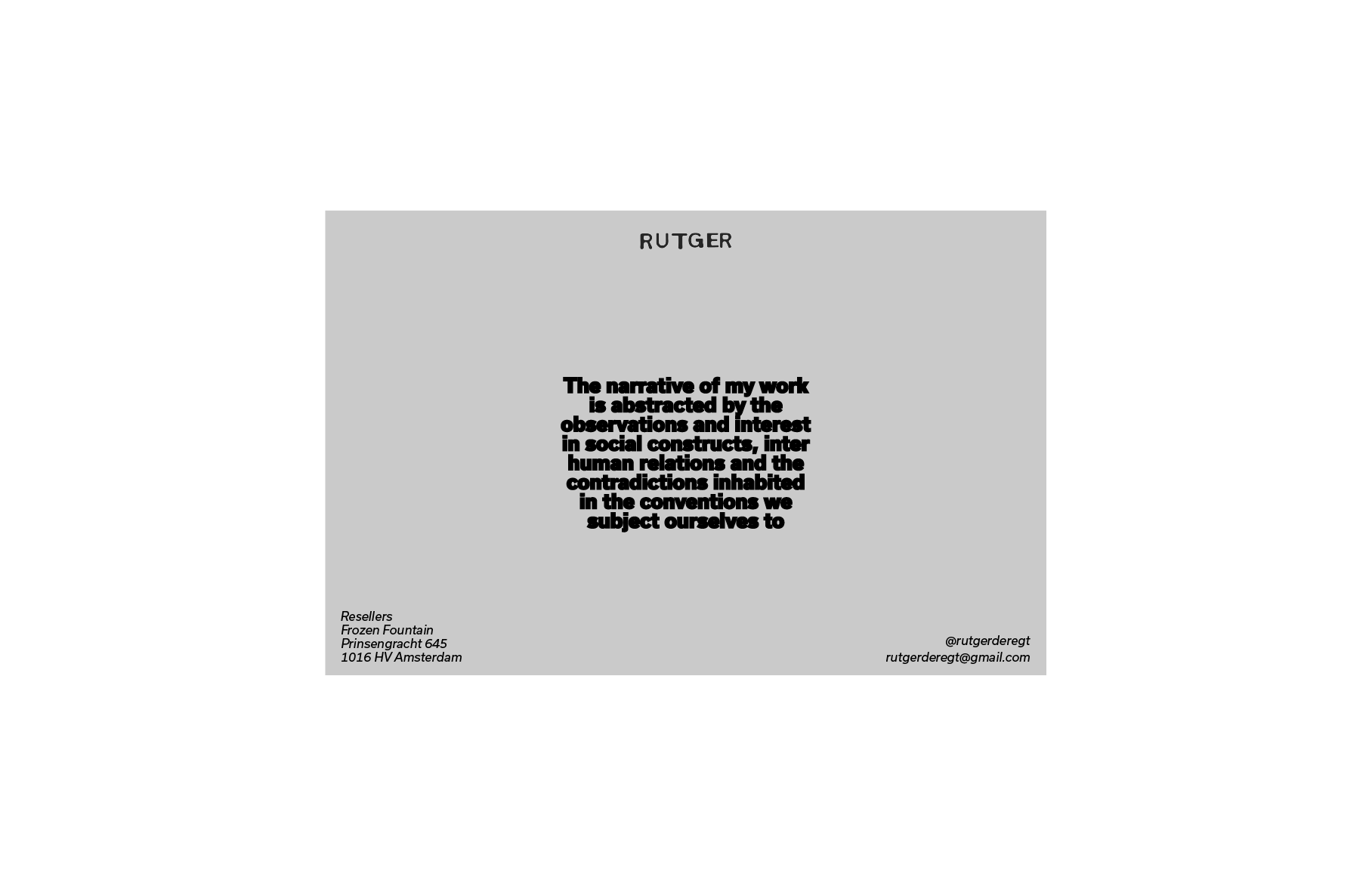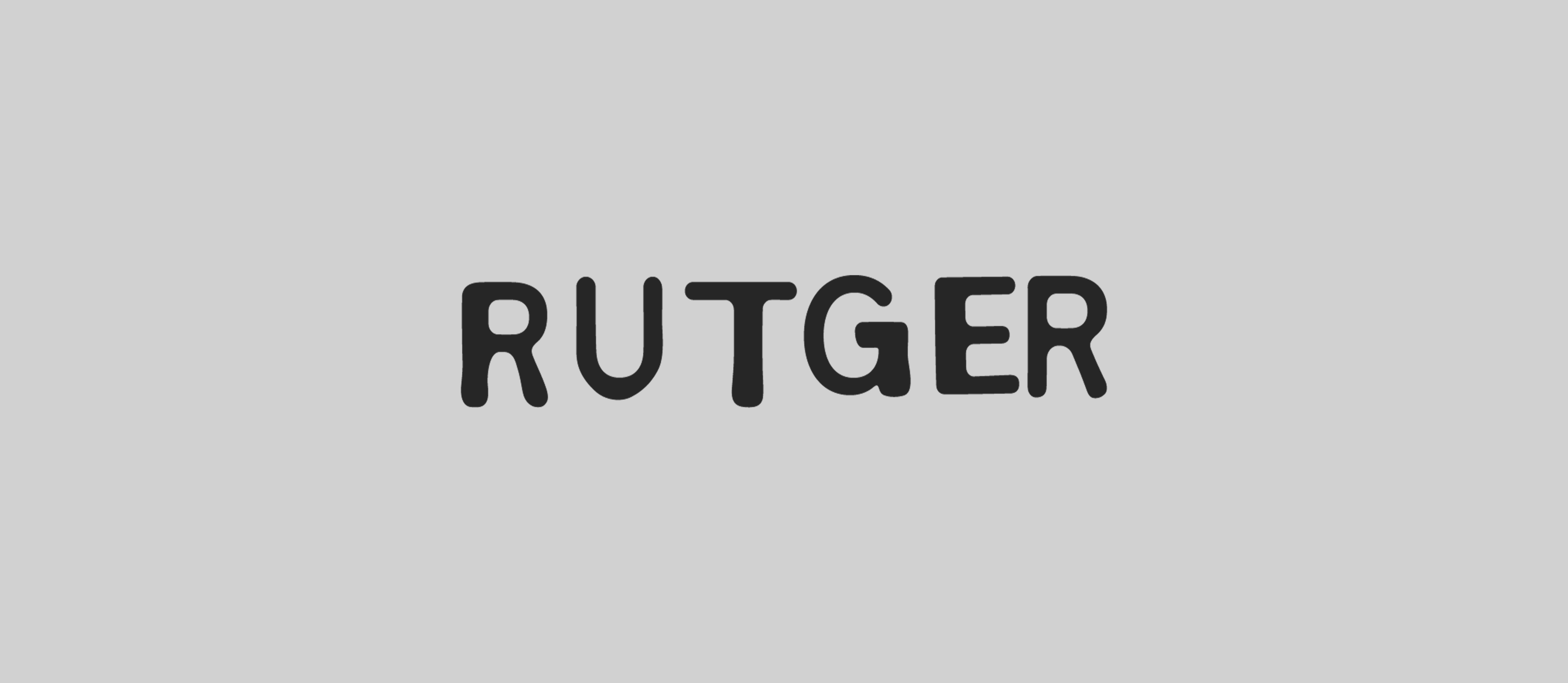 Rutger gav fri leg fra starten, og dette resulterede i at skabe en taktil design med fjogede og interessante bogstav, der kunne leve op til hans unikke værker. Rutger manglede fortælling, og efter en snak, hvor han fik sat ord på hans forhold til hans kunst, fik vi sat en ny ramme for den visuelle retning. Vi skabe et stempel, han kunne markere sine værker med. Dette stammer fra, at han selv brugte bogstaver, man normalt bruger i bagværk til at stemple hans arbejde. Herfra stak ideen af.